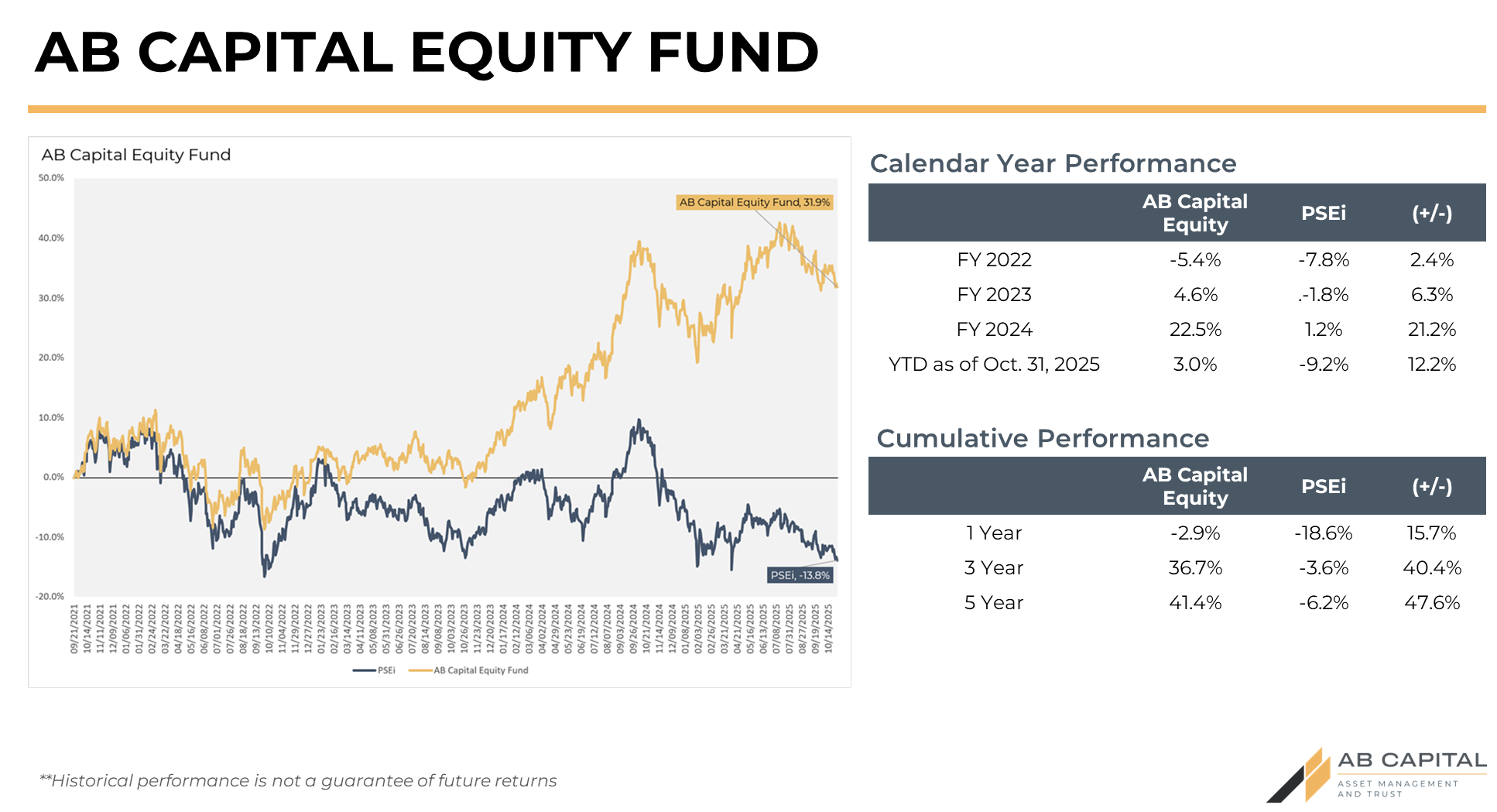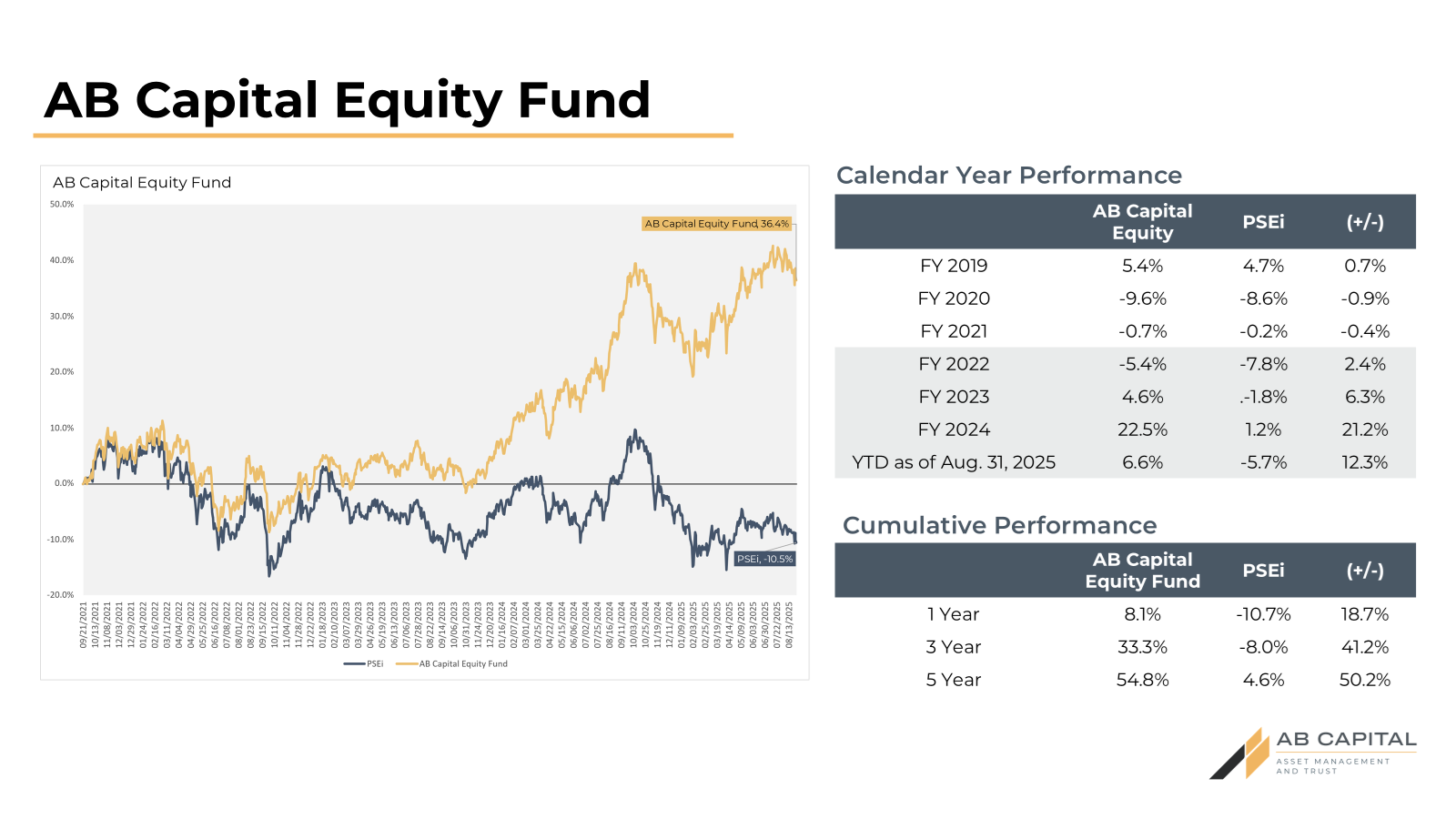 Historical results are not indicative of future performance. AB Capital UITFs are products subject to BSP regulations and are not deposit accounts. Therefore, yields, returns or income are not guaranteed and not insured by the Philippine Deposit Insurance Corporation (PDIC). Any income or loss is for the account and risk of the investors. The trustee shall not be liable for any losses, except upon willful default, gross negligence, fraud or bad faith. The Declaration of Trust governing the funds is available upon request. UITFs have varying levels of risk. Investors are advised to match their risk profiles with the appropriate UITF.