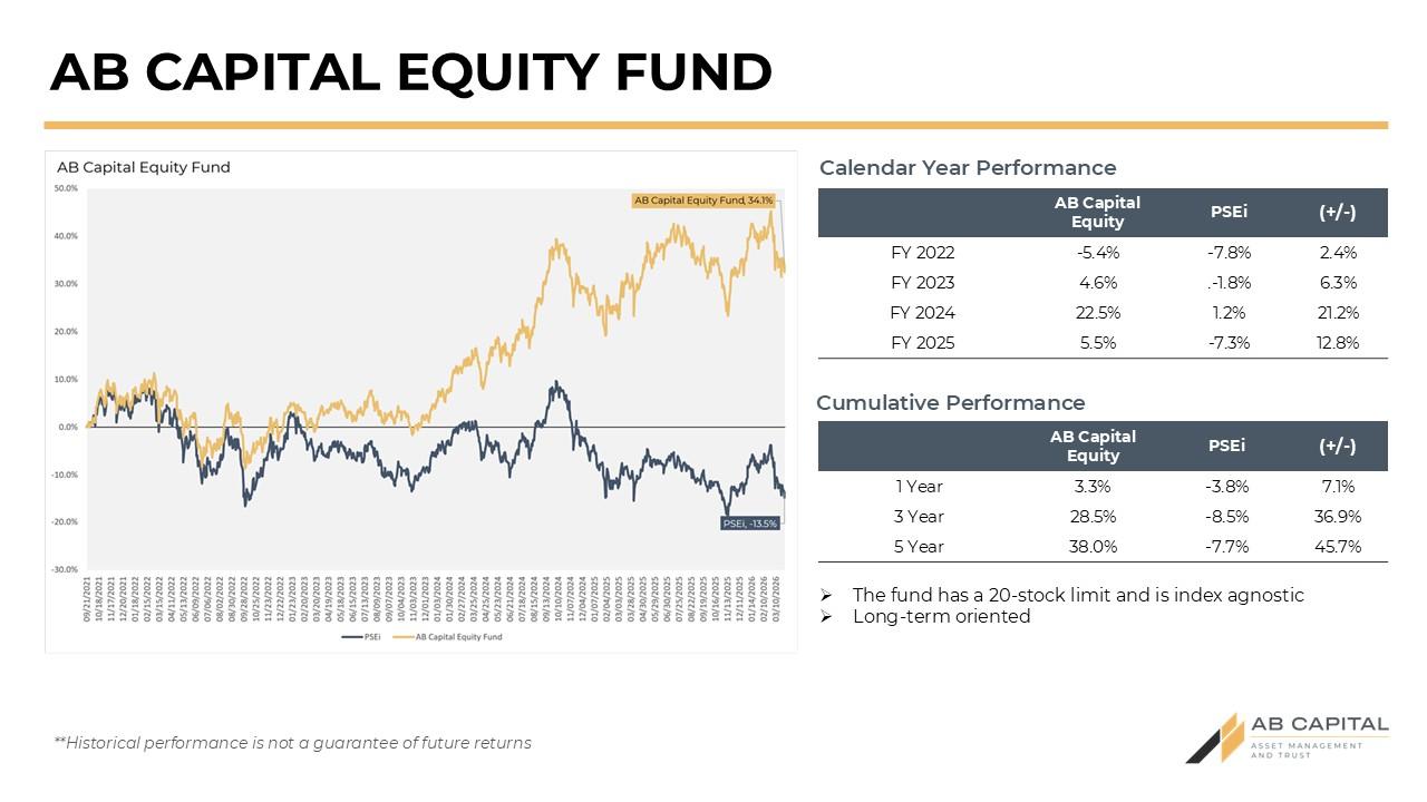Historical results are not indicative of future performance. AB Capital UITFs are products subject to BSP regulations and are not deposit accounts. Therefore, yields, returns or income are not guaranteed and not insured by the Philippine Deposit Insurance Corporation (PDIC). Any income or loss is for the account and risk of the investors. The trustee shall not be liable for any losses, except upon willful default, gross negligence, fraud or bad faith. The Declaration of Trust governing the funds is available upon request. UITFs have varying levels of risk. Investors are advised to match their risk profiles with the appropriate UITF