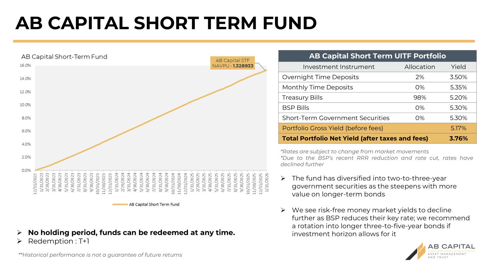 Historical results are not indicative of future performance. AB Capital UITFs are products subject to BSP regulations and are not deposit accounts. Therefore, yields, returns or income are not guaranteed and not insured by the Philippine Deposit Insurance Corporation (PDIC). Any income or loss is for the account and risk of the investors. The trustee shall not be liable for any losses, except upon willful default, gross negligence, fraud or bad faith. The Declaration of Trust governing the funds is available upon request. UITFs have varying levels of risk. Investors are advised to match their risk profiles with the appropriate UIT63