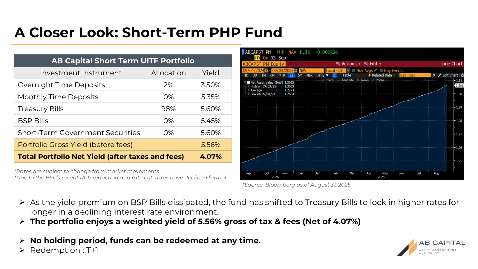 The Fund aims for capital preservation and income generation by investing in a diversified portfolio of fixed income instruments with a maximum portfolio duration of one (1) year. The Fund aims to surpass its benchmark (gross of fees) equivalent to 3-month PHP BVAL reference rate (Bloomberg Code: BV3MRPTB). This benchmark is interpolated by the levels 3-month PHP government treasury bills trade using Bloomberg's proprietary model. The BV3MRPTB rate is then accrued daily to serve as the fund's benchmark on a net of tax basis (less 20% withholding tax).